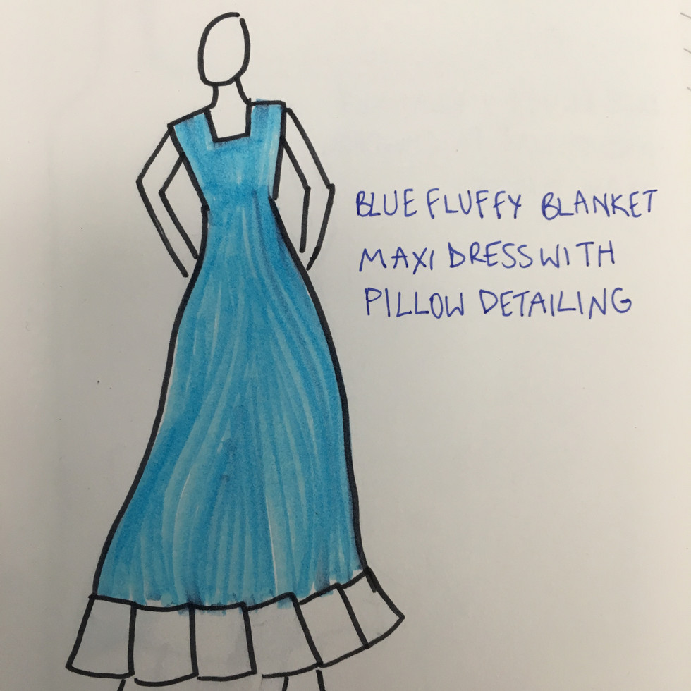 These are some drawings I have done, designing the next phase of the BEDHEAD project. I am going to create outfits inspired by these drawings out of blankets, and work with different colours and textures. I have chosen to use blue fabric, because of the connotations with the colour blue, being a calm colour, and the texture of the fabric is going to be extremely soft, therefore both of them are going to be working with each other, to create as relaxing an outfit as possible.
